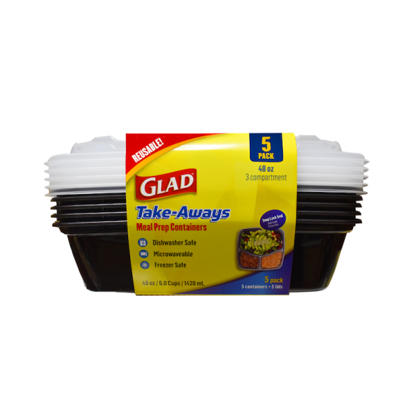 Meal prep like a pro. This 3-compartment container keeps your mains, sides, and sauces in perfect harmony. Glad Take-Aways’ 48oz 3-compartment food container helps streamline prep and portioning with separate sections for each part of your meal. Featuring a leak-resistant Snap-Seal lid and durable, BPA-free construction, it’s safe for microwave, freezer, and dishwasher use. Great for planning ahead and packing balanced meals. Available in a convenient 7-pack belly-band for everyday use and easy storage. Sustainable options available.